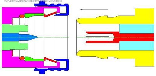 1) 這個設(shè)計(jì)巧妙地把彈簧片設(shè)置在公頭外導(dǎo)體后部,讓公母頭的外導(dǎo)體端面之間實(shí)現(xiàn)剛性接觸,從而達(dá)到端面零間隙,完全符合平面接頭的設(shè)計(jì)原則,使接頭性能得到較大提高,這與QN 把簧片設(shè)置在兩外導(dǎo)體端面之間相比,顯然是一個進(jìn)步。