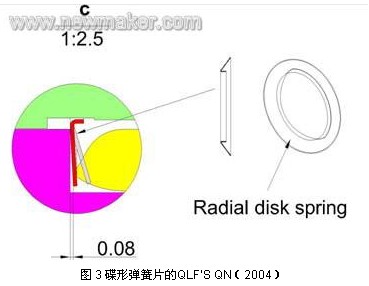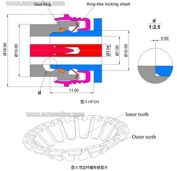繼 SnapN 之后,07 年Anoison 推出了HPQN 設(shè)計(jì),該設(shè)計(jì)在公頭內(nèi)嵌入一雙齒環(huán)碟形鎖緊片(如圖6),當(dāng)公頭和母頭配合后, 固定在公頭上的雙齒環(huán)碟形鎖緊片緊扣在母頭斜面上,其內(nèi)齒的端面對母頭產(chǎn)生推力作用,使外導(dǎo)體的端面之間緊密接觸,間隙為0。并且雙齒環(huán)碟形鎖緊片相鄰的內(nèi)齒長度有差異,使鎖緊時內(nèi)齒停留在母頭斜面的不同圓周上。這種設(shè)計(jì)利用雙齒環(huán)碟形鎖緊片內(nèi)齒的彈力和母頭斜面的支撐力,巧妙地實(shí)現(xiàn)了公頭和母頭端面之間的保持力和接觸壓力,并能達(dá)到非常好的抗震效果。該設(shè)計(jì)的力學(xué)原理很簡單,但是鎖緊片與母頭相對最佳位置的數(shù)據(jù)需要經(jīng)歷大量的試驗(yàn)。