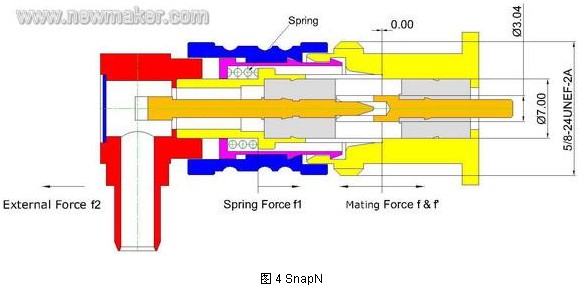 但跟傳統(tǒng)的螺紋連接的N 相比,SnapN 還是有局限性。我們知道 SnapN 外導(dǎo)體端面之間的接觸壓力由其彈簧A 提供--ROSERBERGER 提供的數(shù)據(jù)是30N,根據(jù)力的相互作用原理,我們可以知道接頭的結(jié)合力也是30N。在某些應(yīng)用場合,由于粗重電纜的擺動,傳導(dǎo)到接頭的作用力很容易超30N,一旦超過這個臨界力,外導(dǎo)體端面之間會發(fā)生瞬時分離,而影響信號傳輸。那是否能提高這個臨界力呢?我們知道,彈簧A 對外導(dǎo)體端面提供的接觸壓力與接頭的結(jié)合力是等量的,如果我們增加彈簧作用力---比如增加到100N,那意味著接頭結(jié)合力也達(dá)到100N,顯然,匹配一對接頭需要用100N 的力氣是讓人無法接受的。