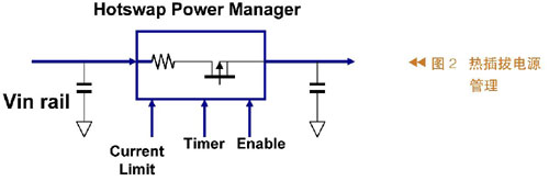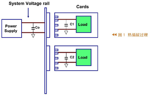 圖1所示為熱插拔過程,其中左邊代表系統(tǒng)及其供電,在供電的輸出端有一個電容,右側(cè)有兩張卡,這些卡的輸入端也有電容。把卡插入系統(tǒng)之前,輸入電容沒有被充電;當把卡插入系統(tǒng)時會有一個很大的瞬間電流向輸入電容充電,這么大的瞬時電流很可能造成系統(tǒng)供電電壓不正常。