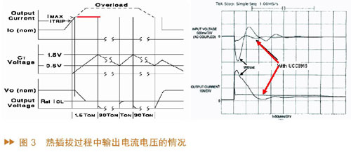 接下來以UCC3915為例說明熱插拔過程中輸出電流電壓的情況。圖3中,左邊圖形是UCC3915的輸出電流、輸出電壓、即時電容電壓的波形,可以看到當輸出電流上升到ITRIP時,計時電容開始充電,電壓上升,開始計時;如果輸出電流超過ITRIP并一直上升到IMAX(設(shè)定的最大值),由于此時MOS管工作在線性模式,將最大輸出電流限制在這一水平而不讓輸出電流上升,因此輸出電流就會被限制在IMAX。
