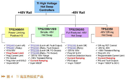 對于高壓熱插拔產(chǎn)品,又可以分為兩類:+48V產(chǎn)品和?48V產(chǎn)品,如圖4所示。48V的產(chǎn)品有TPS2490和2491,這個產(chǎn)品的工作電壓從9V到80V,含有一個獨特的功能叫做定功率的設(shè)定。?48V的熱插拔控制芯片,包括TPS2390、2391、2398和99,這個系列針對簡單的熱插拔的應(yīng)用,工作電壓從?36到?80V,是8只腳的封裝。第二個48V的熱插拔是TPS2392和TPS2393,是屬于全功能?48V的熱插拔產(chǎn)品,除了擁有TPS2390系列的所有功能之外,也含有欠壓和過壓的設(shè)定,提供兩只腳做連接器的檢測。