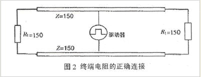 ②阻抗不連續(xù),顧名思義,與光從一種媒質(zhì)進(jìn)入另一種媒質(zhì)時(shí)所引起的反射是相似的。信號在傳輸線末端突然遇到電纜阻抗很小甚至沒有,信號在這個地方就會引起反射。消除這種反射最常用的方法,是在電纜的末端跨接一個與電纜的特性阻抗同樣大小的終端電阻,使電纜的阻抗連續(xù)。由于信號在電纜上的傳輸是雙向的,因此,在通訊電纜的另一端同樣要跨接一個相同大小的終端電阻,如圖2所示。
