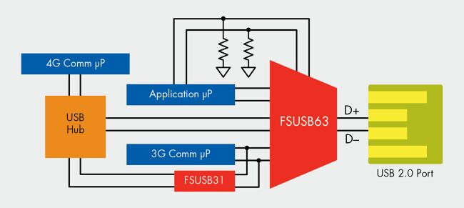 4G手機(jī)的最新趨勢是在手機(jī)中集成兩個(gè)處理元件,同時(shí)訪問USB端口。對于這種應(yīng)用,一個(gè)比較好的選擇是采用集線器。不過麻煩在于USB集線器的接線通常是電容性的,功耗相當(dāng)大;而另一方面,同時(shí)訪問USB端口的機(jī)會又不多。圖2所示為這種手機(jī)的一種設(shè)計(jì)方法,其中,3G通信處理器必需與4G處理器分開來單獨(dú)訪問USB端口。通過一個(gè)隔離開關(guān)(FSUSB31),并采用極短的PCB引線,可以盡量減小電容。這樣一來,在從3G通信處理器到USB主設(shè)備的路徑上,一個(gè)高速發(fā)射USB數(shù)據(jù)眼(data eye)與USB規(guī)范相比有很大的裕量。在這個(gè)例子中,應(yīng)用處理器控制USB 3:1多路復(fù)用開關(guān),當(dāng)后者在待機(jī)模式下處于低電狀態(tài)時(shí),它可以讓自己的控制線路上的上拉和下拉電阻連接到默認(rèn)的應(yīng)用處理器。
