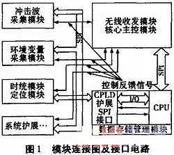 無線傳感器網(wǎng)絡節(jié)點采用模塊化的設計方法,每個節(jié)點包括無線收發(fā)模塊、核心主控模塊和功能模塊。系統(tǒng)通過無線收發(fā)模塊接收主站發(fā)送的命令碼,核心主控模塊對命令解碼,完成對各功能模塊的控制(開啟采集、時統(tǒng)清零等)。系統(tǒng)要完成多次重復性試驗,因此每次試驗完畢要把實驗數(shù)據(jù)(沖擊波數(shù)據(jù)、環(huán)境變量信息、時統(tǒng)跟定位信息等)存儲到數(shù)據(jù)存儲管理模塊統(tǒng)一管理,同時準備下次試驗。系統(tǒng)工作時,數(shù)據(jù)儲存管理模塊SPI接口一方面工作在從模式,接收主控模塊發(fā)送的命令;另一方面工作在主模式,轉發(fā)控制其他功能模塊的命令碼并讀取試驗數(shù)據(jù)進行統(tǒng)一管理,圖1為在其內擴展專用工作在主模式下的SPI接口的模塊問鏈接圖。專用工作在主模式下的SPI接口電路,具有提高模塊間數(shù)據(jù)傳輸速度與靈活性等特點。