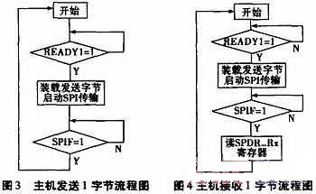 (2)軟件部分:單片機為主控制器,首先查詢從機狀態(tài)標志位READY是否為1,判斷是否可以與從機通信。從機準備就緒時,單片機可裝載1字節(jié)發(fā)送數(shù)據(jù),啟動CPLD內部SPI接口電路,查詢并等待SPI傳輸結束標志位SPIF為1,完成一字節(jié)數(shù)據(jù)傳輸,如此重復。圖3、圖4為主機發(fā)送與接收1字節(jié)流程圖。