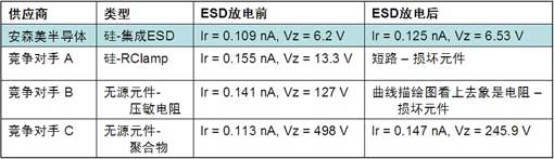 此外,便攜設(shè)備可能遭受多次的ESD電壓應(yīng)力,這在中國北方地區(qū)表現(xiàn)得猶為顯眼。因?yàn)椋獠勘Wo(hù)元件在多種ESD應(yīng)力條件的性能猶為重要,直接決定著便攜產(chǎn)品的可靠性。因此,同樣可以對壓敏電阻、聚合物和硅ESD二極管等保護(hù)元件在Tesec直流測試條件下測試,每個元件都施以總計(jì)2,000次的15 kV接觸放電ESD脈沖(正向及負(fù)向各1,000次),每兩次脈沖的時間間隔為0.1秒。表2所示的測試結(jié)果顯示,安森美半導(dǎo)體的硅集成ESD保護(hù)元件在多重應(yīng)力條件下仍然維持極佳的性能,而競爭器件要么損壞,要么性能退化較嚴(yán)重。