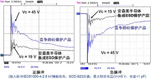 NUP4016和ESD11L5.0D都能在數(shù)納秒時間內(nèi)將15千伏(kV)輸入ESD波形鉗位至不足8伏(V),為當(dāng)今對ESD敏感的集成電路(IC)提供最高保護(hù)水平。這些硅器件沒有無源技術(shù)的磨損問題,在經(jīng)過多次浪涌事件如ESD等后,可靠性和性能都不受影響。