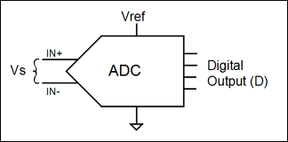 用于將傳感器信號數(shù)字化的ADC也是比例器件。無論其內(nèi)部架構(gòu)如何,所有ADC都是通過對未知輸入電壓與已知參考電壓相比較來工作的。轉(zhuǎn)換器的數(shù)字化輸出是輸入電壓與參考電壓的比值乘以ADC的滿量程讀數(shù)??紤]到內(nèi)部放大和設(shè)計的多樣性,還需要一個比例因子K。無論K值大小,只要ADC的配置未改變,K值都保持固定不變。公式4描述了一個普遍意義上的ADC (圖2)的數(shù)字讀數(shù)(D)和輸入信號(Vs),參考電壓(Vref),滿量程讀數(shù)(FS)以及比例因子(K)間的關(guān)系。