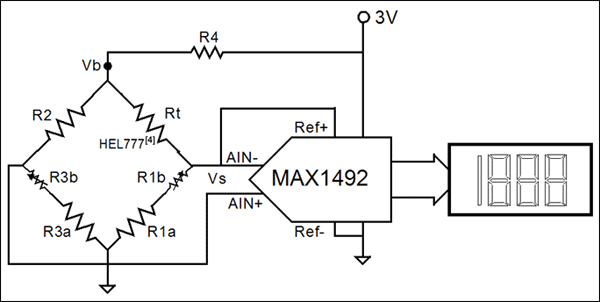 圖10. 在具有數(shù)字顯示的簡單的溫度傳感器中,電橋電路除去0°時的多余信號,使得ADC讀數(shù)等于溫度。