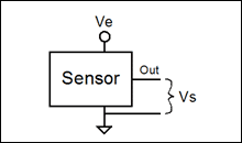 使用阻性元件的傳感器通常令一個電流流過電阻并測量其電壓。在輸出傳感器之前,可以將該電壓進(jìn)行放大或電平偏移,但是其大小仍然與流過電阻的電流相關(guān)。如果該電流來自于電源電壓,那么傳感器的輸出與電源電壓成比例。公式2描述了這類比例傳感器的輸出(圖1),其中Vs是輸出信號,Ve是激勵電壓,S是傳感器的靈敏度,P是所測參數(shù)的量值,C是傳感器的失調(diào)量。