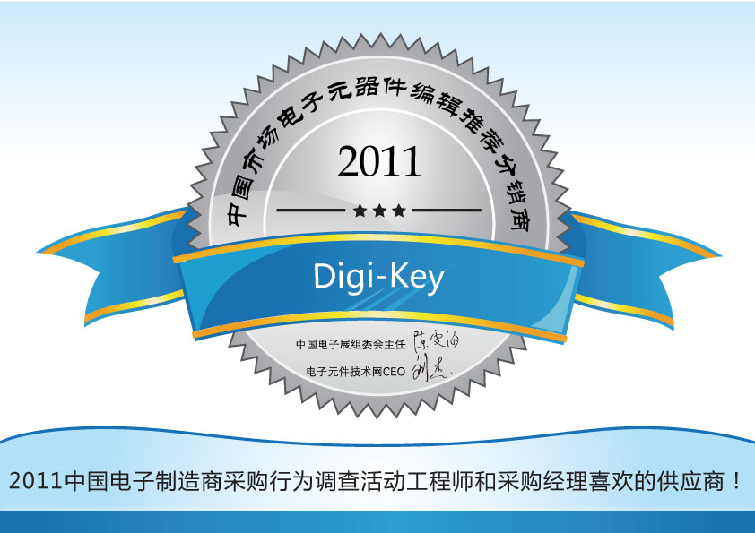 在近日剛剛結(jié)束的2011中國電子制造商采購行為調(diào)查暨中國市場電子元器件領(lǐng)軍廠商的評選活動中,Digi-key憑借廣泛的電子元器件庫存、最全面的在線資源和快速響應(yīng)客戶訂單等多方面優(yōu)勢,以及在工程師心目中形成的良好形象,一舉榮獲2011中國市場電子元器件編輯推薦分銷商稱號!