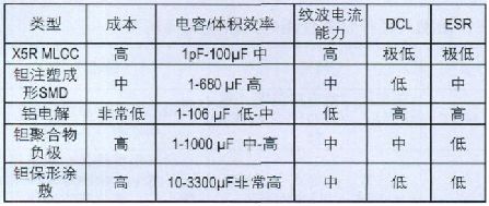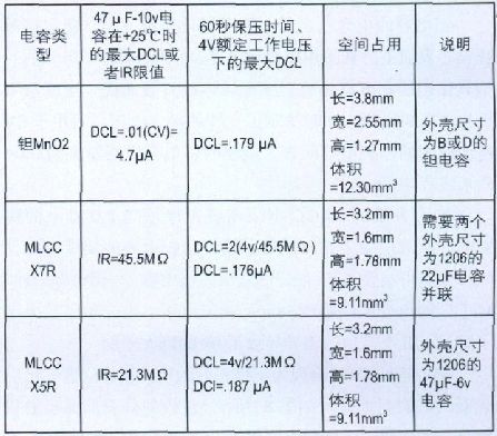 MLCC具有良好的低DCL特性,但在某些情況下,鉭電容能夠以更小的體積提供同樣低的DCL.表5 比較說明了根據(jù)DCL要求正確評(píng)估和選擇合適的電容的計(jì)算方法。如表5所示,鉭電容一般按照DCL最大值來確定規(guī)格。標(biāo)準(zhǔn)二氧化錳 (MnO2)構(gòu)造的鉭電容在生產(chǎn)廠家處是按照 (。01xCV) 進(jìn)行分級(jí)的。某些電容生產(chǎn)廠家還會(huì)隨DCL信息提供具體的保壓時(shí)間,并且根據(jù)比同級(jí)別的DCL最大值低得多的具體DCL限值進(jìn)行電容器的預(yù)篩選。