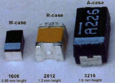 借助M.A.P.工藝,鉭電容的外殼尺寸一路從A下降到0805(目前的技術(shù))到0603或者0402.鉭粉的改良可以把10?F~10V容量的0805外殼尺寸減少到0603的外殼尺寸,如圖 4 所示。