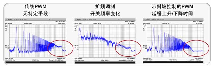 要滿足智能手機揚聲器放大器的這些期望性能要求,D類放大器是極佳選擇。如D類放大器提供極低EMI,避免與其它RF電路產生干擾。實際上,D類放大器將輸入的模擬音頻信號轉換為脈寬調制(PWM)的脈沖信號,再以此脈沖信號控制開關器件來導通/關閉音頻功率放大器。對于智能手機應用而言,要降低音頻輸出段的EMI,重要的是減少較高頻率的頻譜部分。傳統(tǒng)PWM技術沒有特定手段來應對。但要做到這一點,可以采用兩種技術,一是PWM擴頻調制(開關頻率變化),一是帶斜坡控制的PWM(延緩上升/下降時間)。相比較而言,斜坡控制技術比擴頻調制技術在減少較高頻率的頻譜方面更為有效,更有利于降低EMI。