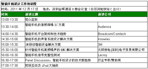 HTC、SAMSUNG、LG、SHARP、AT&T、SK Telecom、PANTECH、DoCoMo 等手機設計領軍廠商在智能市場領域的競爭非常激烈,他們都用到哪些技術?由我愛方案網(wǎng)(www.52solution.com)、電子元件技術網(wǎng)(m.acetelecommunications.com)和China Outlook Consulting主辦的首屆智能手機設計工作坊(Smart Phone Design Workshop)將于2011年12月17日下午在深圳金暉酒店8樓會議室隆重召開!為您Hold 住 2012 智能趨勢,給力手機開發(fā)設計!