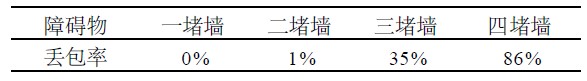 ②數(shù)據(jù)傳輸距離為30 m時,隨著障礙物增加而產(chǎn)生的丟包率;實驗數(shù)據(jù)分別如表1、表2所示。