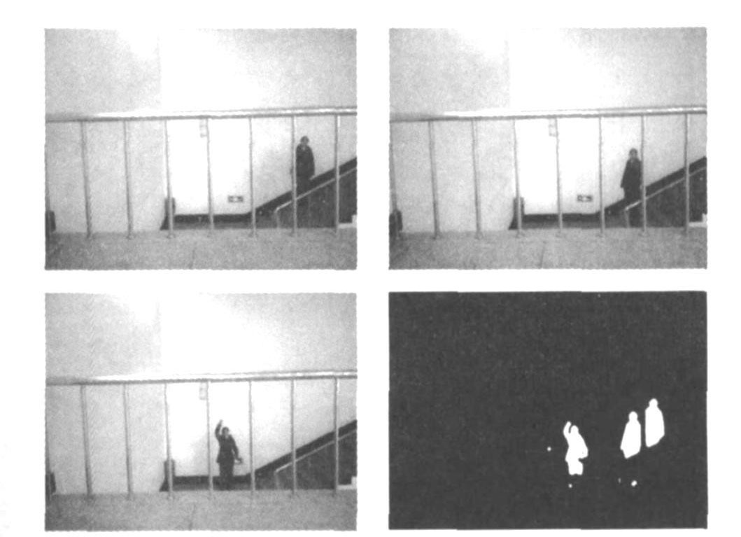 本系統(tǒng)采用運動目標檢測算法,實現(xiàn)對監(jiān)視對象的圖像處理與異常判斷,占背景面積8‰的小目標都能被系統(tǒng)識別。系統(tǒng)有效消除了因環(huán)境光線變化、背景微變、小目標漸進運動等因素引起的系統(tǒng)誤判。采用本系統(tǒng)軟、硬件進行入侵事件檢測,其實驗圖片及檢測效果如圖5所示。