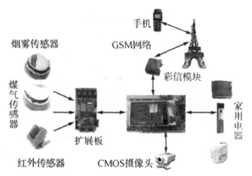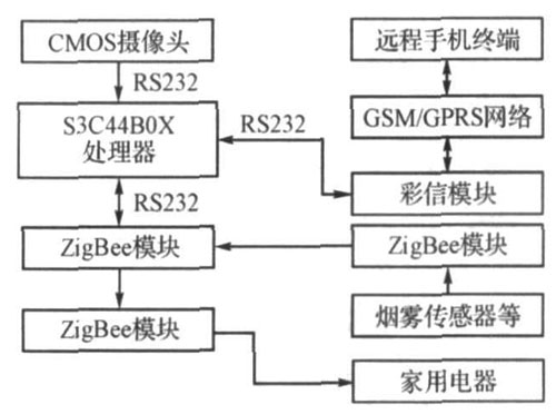 本系統(tǒng)采用模塊化設(shè)計方案。以嵌入式系統(tǒng)主板為核心,通過CMOS攝像頭對關(guān)鍵部位進行安全監(jiān)測,通過手機傳遞安全信息和圖像彩信,并對家用電器進行遠程控制,利用ZigBee模塊實現(xiàn)家用電器、系統(tǒng)主板和煙霧、溫度、煤氣等傳感器的無線聯(lián)網(wǎng)。