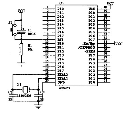 本單片機(jī)通過(guò)RS232串行通信接口與GSM 模塊通信,提取GSM 設(shè)備的短信,發(fā)送相關(guān)的信息,并通過(guò)串行通信接口與紅外模塊相連,利用紅外模塊,達(dá)到主、分機(jī)之間的通信,因此,選用AT89S52芯片。控制上需要用到兩個(gè)串行接口,但89S52只有一個(gè)串口,故還需要在程序中進(jìn)行模擬串行接口通信。其最簡(jiǎn)外部接線電路如圖2所示。