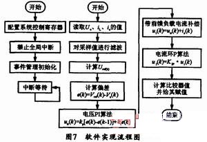 筆者設(shè)計(jì)了一臺(tái)1kVA的逆變電焊電源實(shí)驗(yàn)樣機(jī),其系統(tǒng)的核心控制器是TI的DSP芯片TMS320LF2407A。TMS320LF2407A是一款高性能16位數(shù)字信號(hào)處理器,是TI公司定點(diǎn)DSP2000系列中的一員,它是專門為控制與運(yùn)動(dòng)控制的數(shù)字化實(shí)現(xiàn)而設(shè)計(jì)的。該DSP可完成逆變器輸出電壓頻率的控制、負(fù)載電壓和電流取樣、開關(guān)管的導(dǎo)通關(guān)斷時(shí)間控制等。其軟件實(shí)現(xiàn)流程圖如圖7所示。