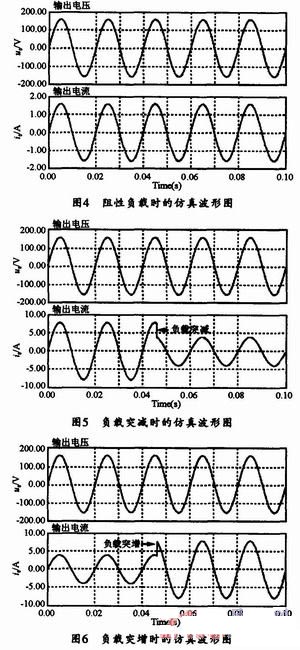 圖4給出了在輸入電壓為200V,額定負(fù)載分別為ZL=100Ω時(shí)的輸出電壓和輸出電流仿真波形;由圖4可見,輸出電壓頻率均能穩(wěn)定在50H z;圖5所示為負(fù)載突減時(shí)的仿真波形,其中突變部分是負(fù)載ZL=20Ω切換到ZL=40Ω時(shí)的輸出電壓、電流仿真波形;圖6為負(fù)載突增時(shí)的仿真波形,其中突變部分是負(fù)載ZL=40Ω切換到ZL=20Ω時(shí)的輸出電壓、電流仿真波形;通過(guò)以上仿真波形圖可知,該系統(tǒng)工作穩(wěn)定,靜態(tài)誤差小,并具有很強(qiáng)的魯棒型,同時(shí),這種電流內(nèi)環(huán)電壓外環(huán)的雙閉環(huán)控制的動(dòng)態(tài)響應(yīng)速度非常快,因此可見,用該方法對(duì)該系統(tǒng)控制電路進(jìn)行設(shè)計(jì)是有效而可行的。