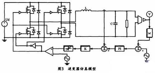 圖3所示是在PSIM下構(gòu)建的逆變器仿真模型。該模型主要有三部分:主電路、控制器和PWM脈沖生成模塊。其中控制器用于實(shí)現(xiàn)電壓電流雙環(huán)控制,為產(chǎn)生PWM脈沖提供調(diào)制信號(hào);PWM脈沖生成模塊采用雙極性調(diào)制方式。根據(jù)整個(gè)系統(tǒng)的閉環(huán)特征方程,并綜合考慮系統(tǒng)的控制要求,再通過(guò)選取阻尼比和自然角頻率,就可以得到系統(tǒng)控制器的參數(shù)。考慮到單相全橋逆變器系統(tǒng)控制的性能要求,在此基礎(chǔ)上所確定的最終系統(tǒng)仿真參數(shù)如下: