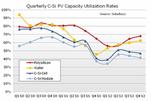 由于產(chǎn)能擴(kuò)張速度過(guò)快,多晶硅和硅片制造環(huán)節(jié)的產(chǎn)能利用率在2011年也出現(xiàn)了大幅的下降,在第四季度都達(dá)到全年最低點(diǎn)。隨著廠商清理庫(kù)存過(guò)程的完成以及需求的回暖,預(yù)計(jì)在2012年硅片和多晶硅的產(chǎn)能利用率將先后回歸到正常水平。
