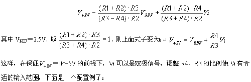 ADS7864模擬輸入通道的+IN和-IN的最大電壓輸入范圍為-0.3V~+5.3V(ADS7864 +5V供電)。圖3的電路中使用了2個(gè)運(yùn)放,A1用作跟隨器,用來緩沖ADS7864輸出的2.5V基準(zhǔn)電壓源;A2和四個(gè)電阻構(gòu)成了信號(hào)調(diào)理網(wǎng)絡(luò),適當(dāng)配置R1~R4電阻可以實(shí)現(xiàn)對(duì)輸入信號(hào)Vi的縮放和平移以適合ADS7864模擬通道的輸入要求。+IN端的輸入電壓表示如下: