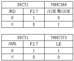系統(tǒng)采用89C51的P2.7尋址ADS7864,地址為8000H,同時(shí)用這個(gè)地址信號(hào)配合89C51的/WR和/RD信號(hào)作74HC244和74HC373的使能信號(hào)。要求當(dāng)89C51的/RD=0,P2.7=1時(shí)才開啟74HC244,讀取ADS7864的轉(zhuǎn)換結(jié)果;當(dāng)89C51的/WR=0,P2.7=1時(shí)74HC373才鎖存89C51 P0口上的數(shù)據(jù)信號(hào),實(shí)現(xiàn)往ADS7864的控制端寫數(shù)據(jù),其它時(shí)候74HC244和74HC373都是關(guān)閉的,這樣避免了89C51 P0口上的其它信號(hào)對(duì)ADS7864的干擾。采用鎖存器74HC373來連接89C51和ADS7864的原因是為了在ADS7864轉(zhuǎn)換數(shù)據(jù)的時(shí)候保持/HOLDA~/HOLDC、A0~A2端的電平保持不變,免得影響ADS7864轉(zhuǎn)換數(shù)據(jù)的精度。74HC244和74HC373的使能信號(hào)真值表如下: