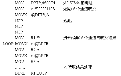根據(jù)真值表,可以用圖4中的邏輯電路來實(shí)現(xiàn)這兩個(gè)使能信號(hào)。系統(tǒng)的最終目標(biāo)就是獲取數(shù)據(jù),然后計(jì)算得出結(jié)果。89C51控制ADS7864轉(zhuǎn)換和讀取轉(zhuǎn)換結(jié)果的代碼如下: