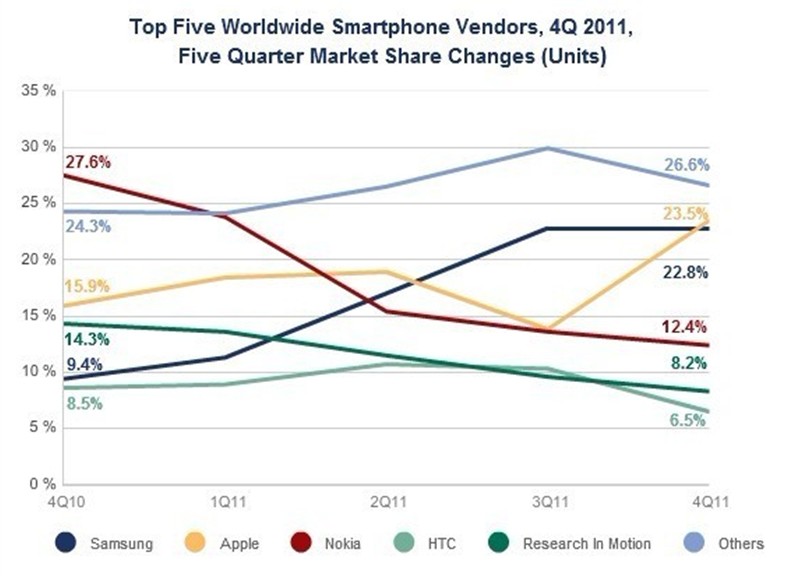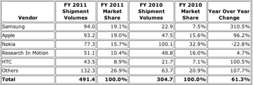 三星在第4季度完成了一系列重大的成就:首次突破了3000萬臺的銷量大關,成為了各大智能手機企業(yè)同比增長最快的企業(yè),同時在2011年成為了智能手機整體市場的領頭羊。其Galaxy系列智能手機的市場份額進一步擴展,先后推出了針對高端市場的Galaxy S II和Galaxy Nexus,以及針對大眾市場的Galaxy Ace以及Galaxy Y等。同時該公司還在Windows Phone Mango的基礎上更新了其Omnia和Focus等產(chǎn)品。