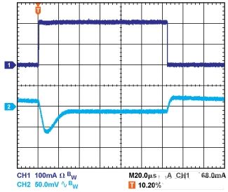 輸出電容還會影響調(diào)節(jié)器對負(fù)載電流變化的響應(yīng)。控制環(huán)路的大信號帶寬有限,因此輸出電容必須提供快速瞬變所需的大多數(shù)負(fù)載電流。當(dāng)負(fù)載電流以500 mA/ μs的速率從1 mA變?yōu)?00 mA時,1 μF電容無法提供足夠的電流,因而產(chǎn)生大約80 mV的負(fù)載瞬態(tài),如圖1所示。當(dāng)電容增加到10 μF時,負(fù)載瞬態(tài)會降至約70 mV,如圖2所示。當(dāng)輸出電容再次增加并達(dá)到20 μF時,調(diào)節(jié)器控制環(huán)路可進(jìn)行跟蹤,主動降低負(fù)載瞬態(tài),如圖3所示。這些示例都采用線性調(diào)節(jié)器ADP151,其輸入和輸出電壓分別為5 V和3.3 V。