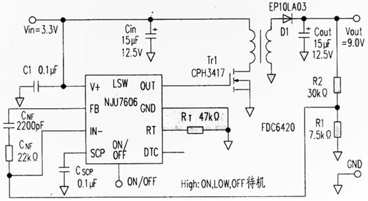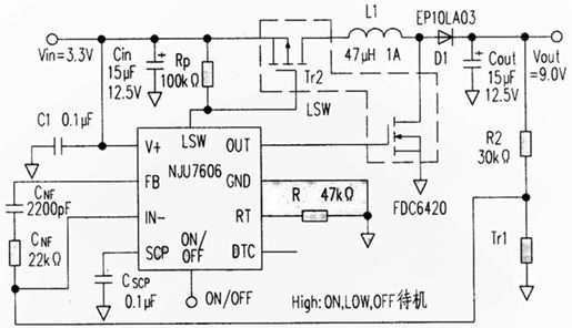 最近廠家生產出了帶負載切斷功能的升壓型變換器IC,使用時采用圖1所示的電路。在待機時借助于P溝道MOSFET Tr2的截止,切斷輸入端和輸出端的直流通路。