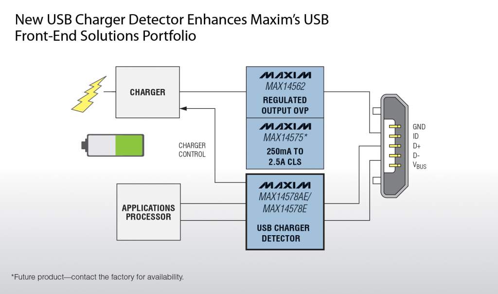 Maxim Integrated Products, Inc 于近日推出業(yè)內(nèi)尺寸最小、符合USB電池充電規(guī)范的USB電池充電檢測(cè)器MAX14578E/MAX14578AE。除了可以檢測(cè)Apple和Sony專有充電器適配器外,該系列器件還可以檢測(cè)USB標(biāo)準(zhǔn)下行端口(SDP)、USB充電下行端口(CDP)或?qū)S贸潆娖鞫丝?DCP)。一旦檢測(cè)到充電端口,MAX14578E/MAX14578AE將控制外部鋰離子(Li+)電池充電控制器,以優(yōu)化充電時(shí)間和充電效率。