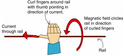 根據(jù)Maxwell方程式,移動(dòng)走線中的電荷可以產(chǎn)生一電流,此電流又會(huì)產(chǎn)生一磁場(chǎng),這種被移動(dòng)電荷產(chǎn)生的磁場(chǎng)稱作「磁通線(magnetic lines of flux)」。使用「右手法則(Right-Hand Rule)」可以輕易地指出磁通線的方向,如附圖四所示。右手拇指代表走線電流流動(dòng)的方向,其余卷曲的手指包圍著走線,代表磁場(chǎng)或磁通線的方向。此外,時(shí)變磁場(chǎng)會(huì)產(chǎn)生一個(gè)垂直的電場(chǎng)。射頻輻射是此磁場(chǎng)和電場(chǎng)的組合。藉由輻射或?qū)щ姷姆绞?,磁?chǎng)和電場(chǎng)會(huì)離開PCB結(jié)構(gòu)。