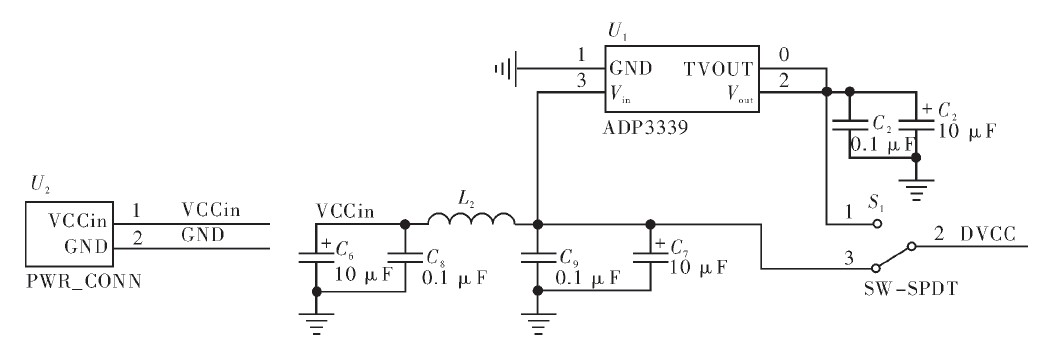 傳感器節(jié)點體積微小,通常攜帶能量有限的電池。能量供應模塊在無線傳感器節(jié)點中至關重要,為傳感器節(jié)點各部分提供能量。需要長時間數(shù)據(jù)采集的傳感器有的需要太陽能等方式來維持節(jié)點的正常運轉(zhuǎn)。節(jié)點的各部分也需要精心設計。節(jié)點微處理器的工作電壓為1.8~3.6 V,無線射頻芯片工作電壓為2.1~3.6 V,Flash供電電壓為2.7~3.6 V,USB轉(zhuǎn)換芯片由USB供電。因此電源可以選用3 V紐扣電池供電,有效減少了節(jié)點的大小。另外USB也可以作為供電源,同時作為編程電源,電源單元如圖2所示。LC濾波單元對交流電具有較好的濾波效果,同時又不會降低直流輸出電壓。低壓差的穩(wěn)壓器ADP3339保證了電源較好的穩(wěn)壓性。