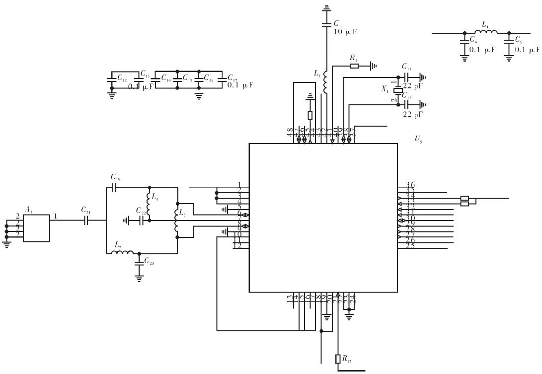 圖3中無線射頻模塊的外圍電路采用CC2420手冊提供的典型應用電路的器件數(shù)值,這樣保證了芯片能工作在正常狀態(tài)。另外為達到最優(yōu)性能,必須使用電源去耦,去耦電容和電源過濾的設置和大小對于在應用中獲得最優(yōu)性能起著關鍵作用,TI提供一個緊湊的參考設計,必須嚴格按照該設計進行。同時增加數(shù)字、模擬電源采用電容濾波。CC2420需要一個16 MHz的參考時鐘用于傳輸速率為250 kbit·s-1的數(shù)據(jù)收發(fā),參考時鐘可以來自外部時鐘源,也可以由內(nèi)部晶體振蕩器產(chǎn)生,這里采用內(nèi)部晶體振蕩器產(chǎn)生的方式。天線阻抗匹配至關重要,為獲得較好的發(fā)射功率,在原有基礎上對部分電容、電感進行了適當?shù)恼{(diào)整。CC2420與微控制器的通信通過4線SPI總線實現(xiàn)(SI、SO、SCLK、CSn),通過控制FIFO和FIFOP管腳接口狀態(tài)可以使芯片工作在發(fā)射或接收模式,另外CCA用于空閑信道評估,SFD用于控制時鐘或定時信息的輸入。