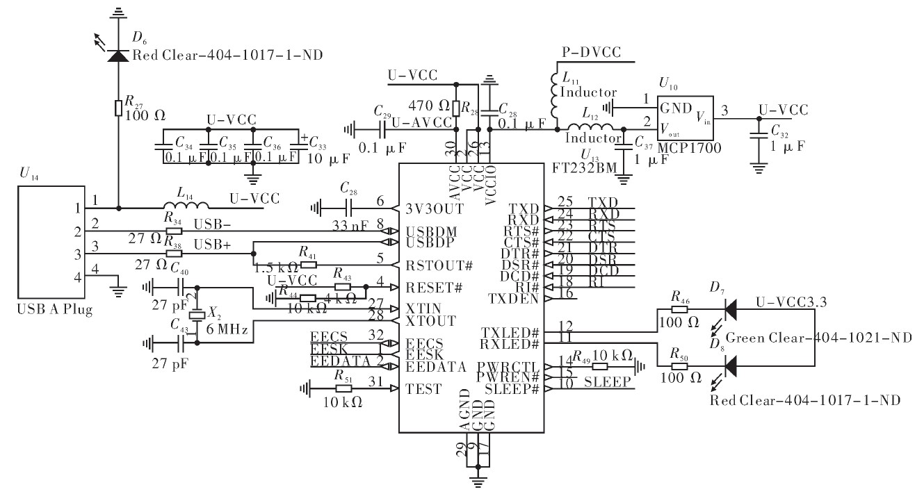 無線傳感器網(wǎng)絡由大量節(jié)點組成,這些節(jié)點按一定協(xié)議將采集的數(shù)據(jù)進行融合、傳輸,最終將數(shù)據(jù)傳送到個人電腦上進行處理和觀察,同時節(jié)點工作需要將特定的程序?qū)懭隖lash中。目前個人電腦最常用的接口為USB,而微處理器使用USART接口,為實現(xiàn)兩種接口之間轉(zhuǎn)換,節(jié)點使用FT232BM芯片作為轉(zhuǎn)換芯片。FT232BM是一種單片USB到異步串口轉(zhuǎn)換芯片,支持全握手和調(diào)制解調(diào)接口信號,在TTL級數(shù)據(jù)傳輸速度范圍為300 bit·s-1~3 Mbit·s-1.芯片通過USB總線供電,工作電壓為4.35~5.25 V,采用外部6 MHz時鐘。USB PID、序列號和產(chǎn)品信息可以保存在外部EEPROM中。USB通信模塊接口如圖5所示。