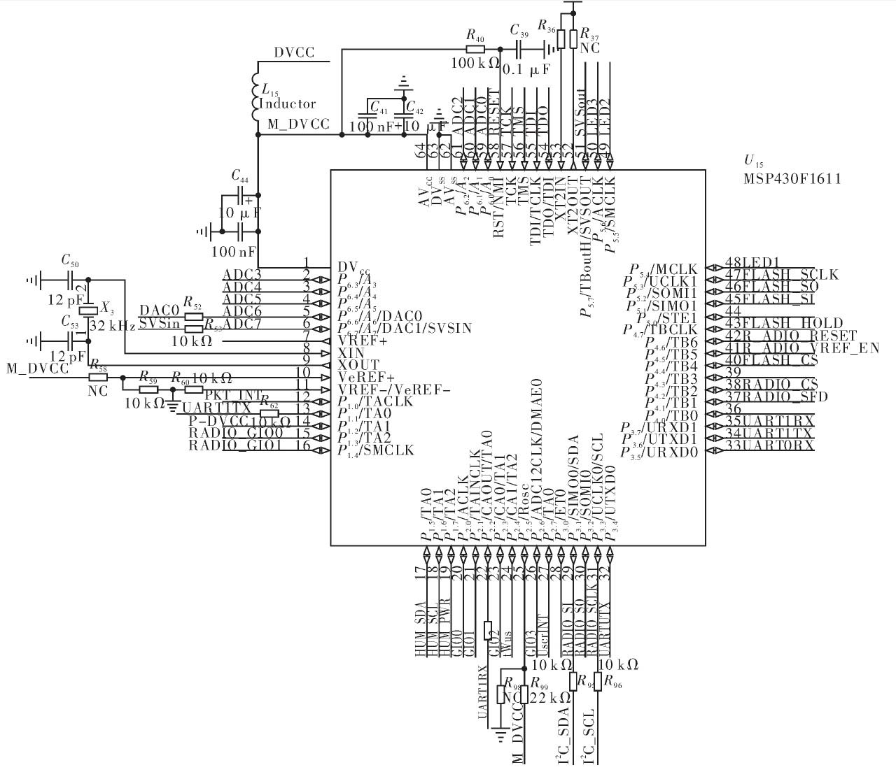 微處理器是無線傳感器節(jié)點的核心,傳感器數(shù)據(jù)的數(shù)據(jù)處理,串行口以及無線模塊的傳輸與控制均需要微處理器的參與。節(jié)點微處理器TI公司的16為超低功耗MSP430F1611.該微處理器工作電壓為1.8~3.6 V,在RAM數(shù)據(jù)保持方式下耗電僅為0.2μA,在激活工作1 MHz的情況下為330μA,可以工作在5中低功耗模式,喚醒時間<6μm.Flash大小為48 kB,RAM大小為10 kB.芯片內(nèi)部有16位定時器Timer_A和Timer_B具有捕獲/比較功能;大量的捕獲/比較寄存器可用于事件計數(shù)、時序發(fā)生等;多功能串口(USART)可以實現(xiàn)異步、同步和I2C串行通信,可以方便地實現(xiàn)多級通信的應用;具有較多的I/O端口,最多達6×8條I/O口線,P1、P2口還可以接收外部上升或下降沿的中斷輸入;12位A/D轉(zhuǎn)換器有較高的轉(zhuǎn)換速率,最高可達200 kbit·s-1,能滿足大多數(shù)數(shù)據(jù)采集的應用。微處理器模塊如圖6所示。溫度濕度傳感器連接P1口5、6、7管腳,無線模塊SPI接在P3口1、2、3和P4.4管腳,USB通信模塊數(shù)據(jù)線連接到P3口6、7管腳。其他管腳分別用于控制和擴展接口。外部晶振大小為32MHz。