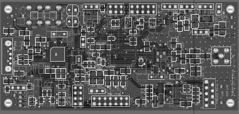 電路板根據(jù)不同的標準有不同的分類,在設計中大多數(shù)根據(jù)板的數(shù)目分類,在電氣連接關系復雜的電路板設計中,雙面板難以滿足電路布線的要求,這時就必須考慮使用多層板。本節(jié)點采用4層板,頂層主要是USB模塊和無線模塊,底層為微處理器模塊,內(nèi)部層為電源層和地層。設計結果如圖7所示。
