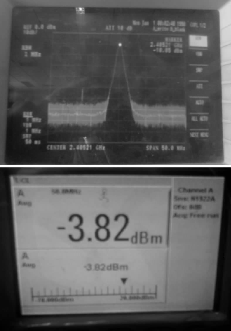 為對設計的節(jié)點功能進行驗證,首先使用IAR集成開發(fā)環(huán)境編寫CC2420的測試程序,通過JTAG將程序燒入Flash,經(jīng)過檢測,射頻部分較好地滿足了預期。芯片工作頻帶范圍為2.4~2.48 GHz,發(fā)射功率為0 dBm.經(jīng)過頻譜儀和頻率計驗證設計符合要求,驗證結果如圖9所示。