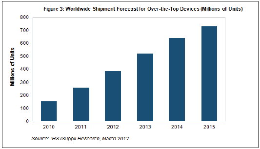 據(jù)IHS iSuppli公司的消費(fèi)平臺(tái)專題報(bào)告,到2015年,支持OTT的產(chǎn)品出貨量預(yù)計(jì)將從2011年的2.58億個(gè)增長(zhǎng)到7.31億個(gè)。今年支持OTT的產(chǎn)品出貨量預(yù)計(jì)將達(dá)到3.848億個(gè),比2011年增長(zhǎng)近50%,如下圖所示。2011年這個(gè)OTT市場(chǎng)強(qiáng)勁增長(zhǎng)68%。