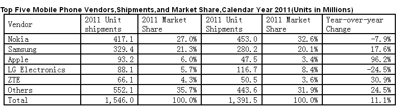 2011 年第四季度,全球共賣出4.274 億部手機(jī).同比去年( 4.028 億部)上升6.1 % ,這一漲勢高于IDC此前預(yù)測的4.4 % 漲幅,但低于2011 年第三季度9.3%的增幅。其中功能機(jī)的市場份額比預(yù)期的衰減速度更快,市場增幅為兩年來最低。