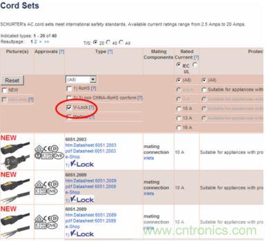 在網(wǎng)頁(yè)選型工具“cord sets”(電源線)中,選擇V-Lock標(biāo)簽及諸如連接器類型、國(guó)家插頭或其它特性等選擇標(biāo)簽,即可輕松選擇。
