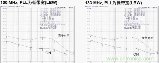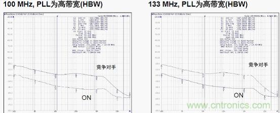 另外,多個(gè)PLL分層布置時(shí),用戶可調(diào)節(jié)帶寬對(duì)時(shí)鐘樹(shù)進(jìn)行系統(tǒng)優(yōu)化。使用HBW(高帶寬)擴(kuò)頻時(shí)鐘時(shí)用于維持?jǐn)U頻特性,從而將輸入與輸出相位差減至最小;使用LBW (低帶寬)可濾除PLL帶寬內(nèi)的時(shí)鐘輸入抖動(dòng)。