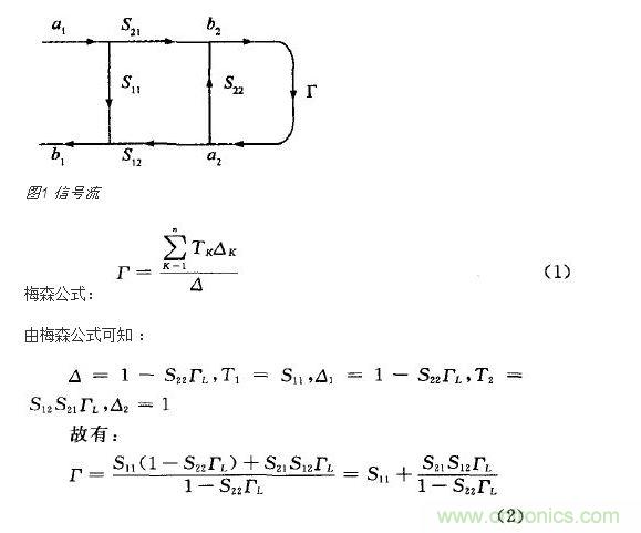 信號(hào)流圖(如圖1所示)結(jié)合散射參數(shù)是分析微波網(wǎng)絡(luò)和微波測(cè)量系統(tǒng)的簡(jiǎn)便有效方法。流圖公式亦稱(chēng)梅森不接觸環(huán)法則(Mason’s non-touching loop rule),簡(jiǎn)稱(chēng)梅森公式。根據(jù)梅森公式可以直接求出信號(hào)流圖中任意兩點(diǎn)之間的傳輸值。