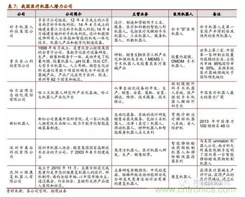 隨著醫(yī)用機器人技術(shù)的不斷突破和發(fā)展,從2005年開始我國有一批重點高??蒲嗅t(yī)院單位及研究所在研究醫(yī)用機器人系統(tǒng)并取得了一些小成就,比如哈工大的微創(chuàng)腹腔外科手術(shù)機器已經(jīng)成功被專家驗收,天津大學(xué)的妙手機器人在今年3月份開始臨床使用;同時,隨著醫(yī)用機器人商業(yè)化市場化的可能性愈發(fā)明晰,已經(jīng)有部分企業(yè)正在生產(chǎn)或者打算進軍醫(yī)用機器人細(xì)分行業(yè),其中就包括機器人領(lǐng)先企業(yè)的博實股份和新松機器人。