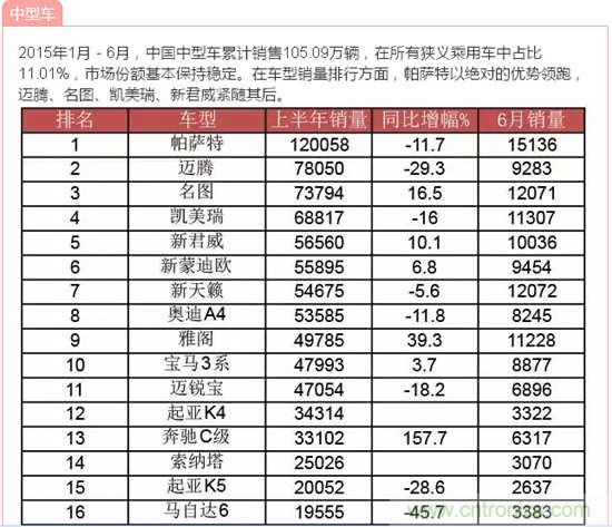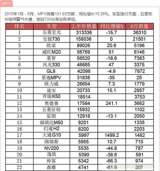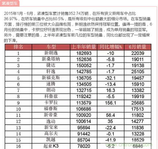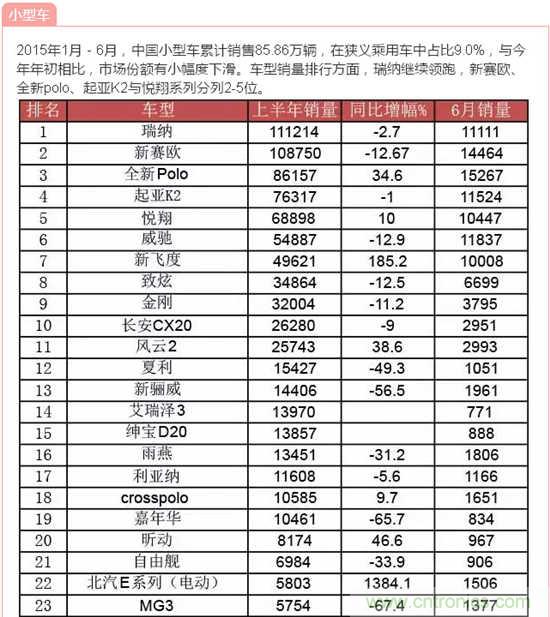 據(jù)中國汽車工業(yè)協(xié)會(huì)發(fā)布的數(shù)據(jù),2015年6月,汽車產(chǎn)銷量環(huán)比下降,同比繼5月后再次雙雙下降;上半年,汽車產(chǎn)銷增速比上年同期明顯回落。說到汽車,小編想到了由我愛方案網(wǎng)承辦的“創(chuàng)業(yè)之星”2015全球創(chuàng)客大賽成都賽場(chǎng)中的一個(gè)參賽項(xiàng)目:智能車載太陽能轉(zhuǎn)化防護(hù)裝置,它改變?cè)扔扇斯ふ周囐M(fèi)時(shí)費(fèi)力方法,完全達(dá)到遙控自動(dòng)罩車,屬于汽車產(chǎn)品領(lǐng)域的一項(xiàng)新技術(shù),歡迎大家到淘方案上了解詳情!下面跟著小編來看看中國汽車在2015年1月-6月的銷量數(shù)據(jù)!歡迎參與互動(dòng)分享!