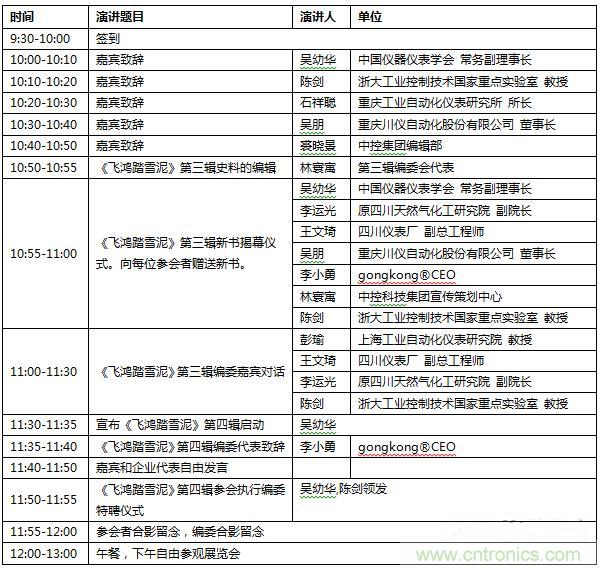 中國儀器儀表學(xué)會常務(wù)副理事長吳幼華,浙大工業(yè)控制技術(shù)國家重點實驗室陳劍教授,重慶工業(yè)自動化儀表研究所石祥聰所長,重慶川儀自動化股份有限公司總經(jīng)理吳朋,中控集團(tuán)編輯部裘曉景將分別發(fā)表致辭,闡述中國儀表和自動化的發(fā)展與現(xiàn)狀。林寰寓將代表第三輯編委會與大家分享《飛鴻踏雪泥》第三輯史料編輯的心路歷程,gongkong®CEO李小勇將與吳幼華、李運光、王文琦等專家一起參加《飛鴻踏雪泥》第三輯新書揭幕儀式及嘉賓對話環(huán)節(jié)。李小勇先生還將代表《飛鴻踏雪泥》第四輯編委,發(fā)表致辭,預(yù)祝第四輯出版成功!